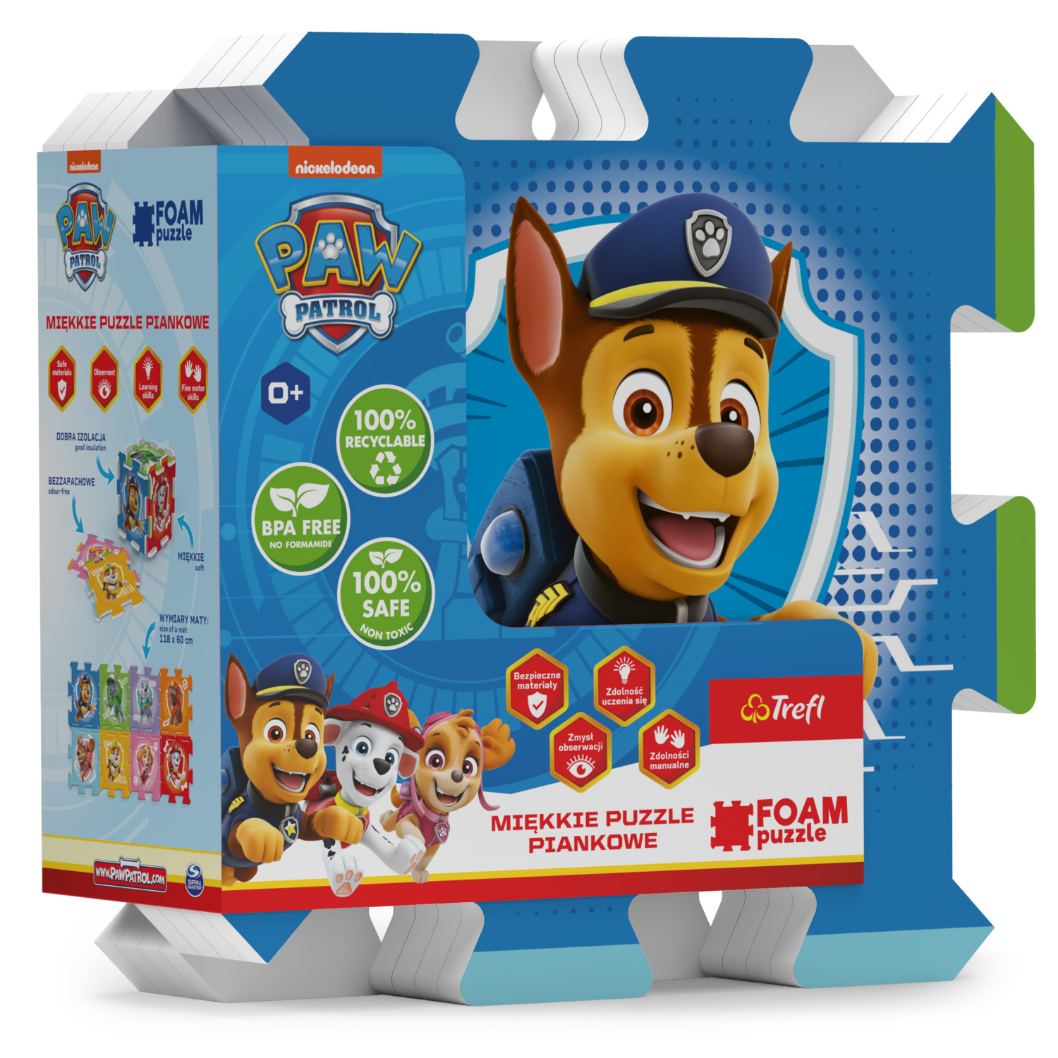 Trefl PĚNOVÉ PUZZLE - Paw Patrol. Licenčné penové puzzle. Obsahujú 8 veľkých dielikov, sú mäkké, farebné, ľahko umývateľné a dajú sa z nich stavať 3D tvary, napr. kocka alebo krabica. Môžu byť tiež použité ako podložka na hranie. Penové puzzle rozvíjajú detskú predstavivosť a pomáhajú deťom učiť sa farby a tvary. Sú vyrobené z netoxického materiálu, BPA free.