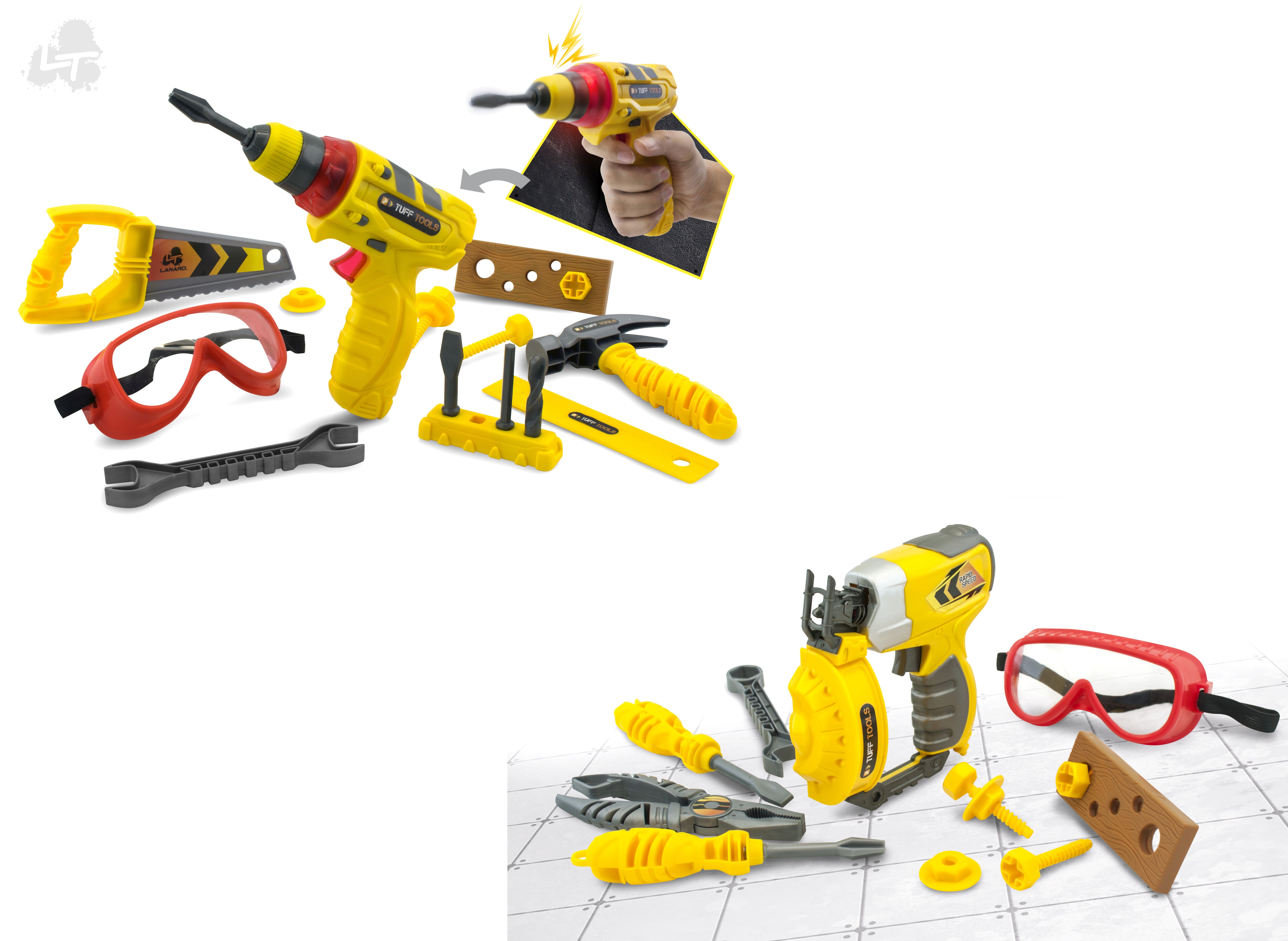 Tuff Tools Nástroje set s okuliarmi. Obsah balenia - elektrická vŕtačka so svetelnými a zvukovými efektmi, ochranné okuliare, skrutky s maticami 6ks, 4 vymeniteľné vrtáky a skrutkovače, kľúč, píla, kladivo. 3xAG13 batérie sú súčasťou balenia.