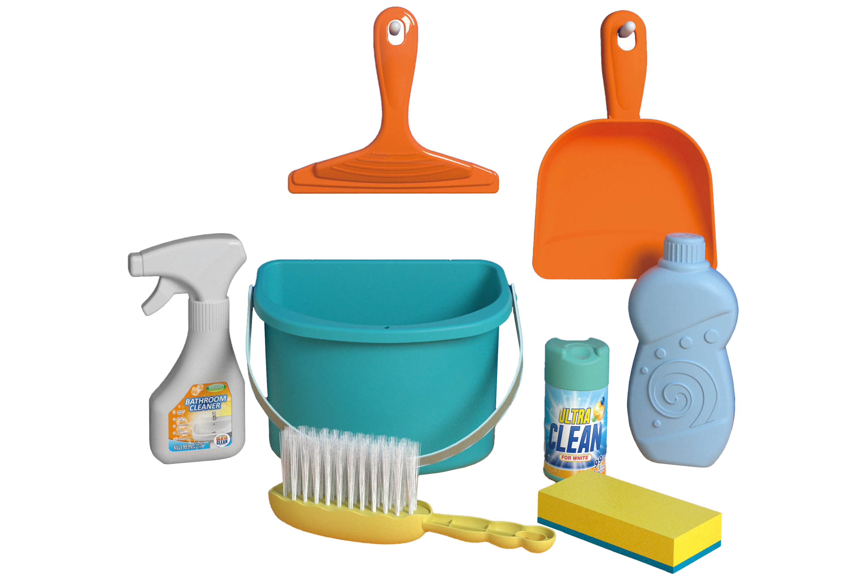 Úklidový set 8ks. Obsahuje vedro, lopatku, stierku, čistiace prostriedky, smetáčik.