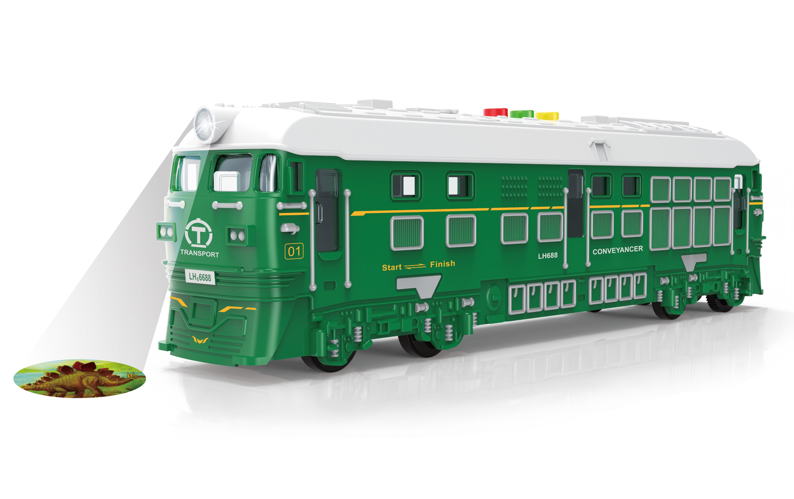 Vlak na setrvačník s efektmi a projekciou zelený. Rozmery 33x8x6 cm. Vydáva svetelné a zvukové efekty, projekciu. Aktivácia tlačidlami na streche (zvuky vlaku a železnice). Batérie 3xAG13, súčasťou balenia.