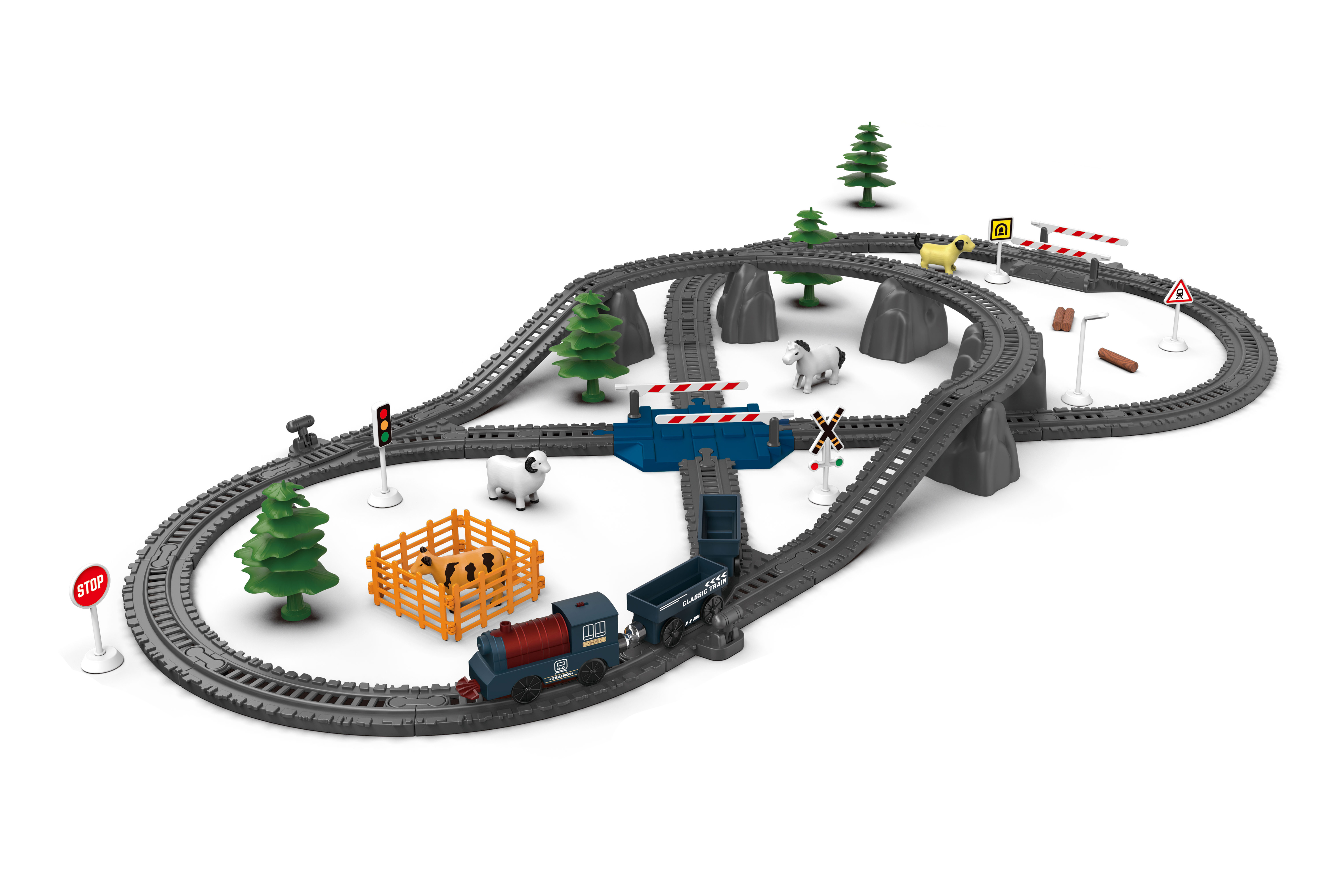 Vlaková dráha s efektmi. Rozmery zostavenej dráhy 112x61x7,5 cm. Vláčik je prepojený magnetmi. Dráha vydáva zvukové efekty. Aktivácia prepínačom na mašinke - smerové tlačidlá pre jazdu v danom smere. Časť dráhy aktivuje zvukové efekty, 1x3V CR2032 batéria je súčasťou. Vláčik - 1xAA (1,5V), nie je súčasťou. Sada sa skladá z 90 dielov.