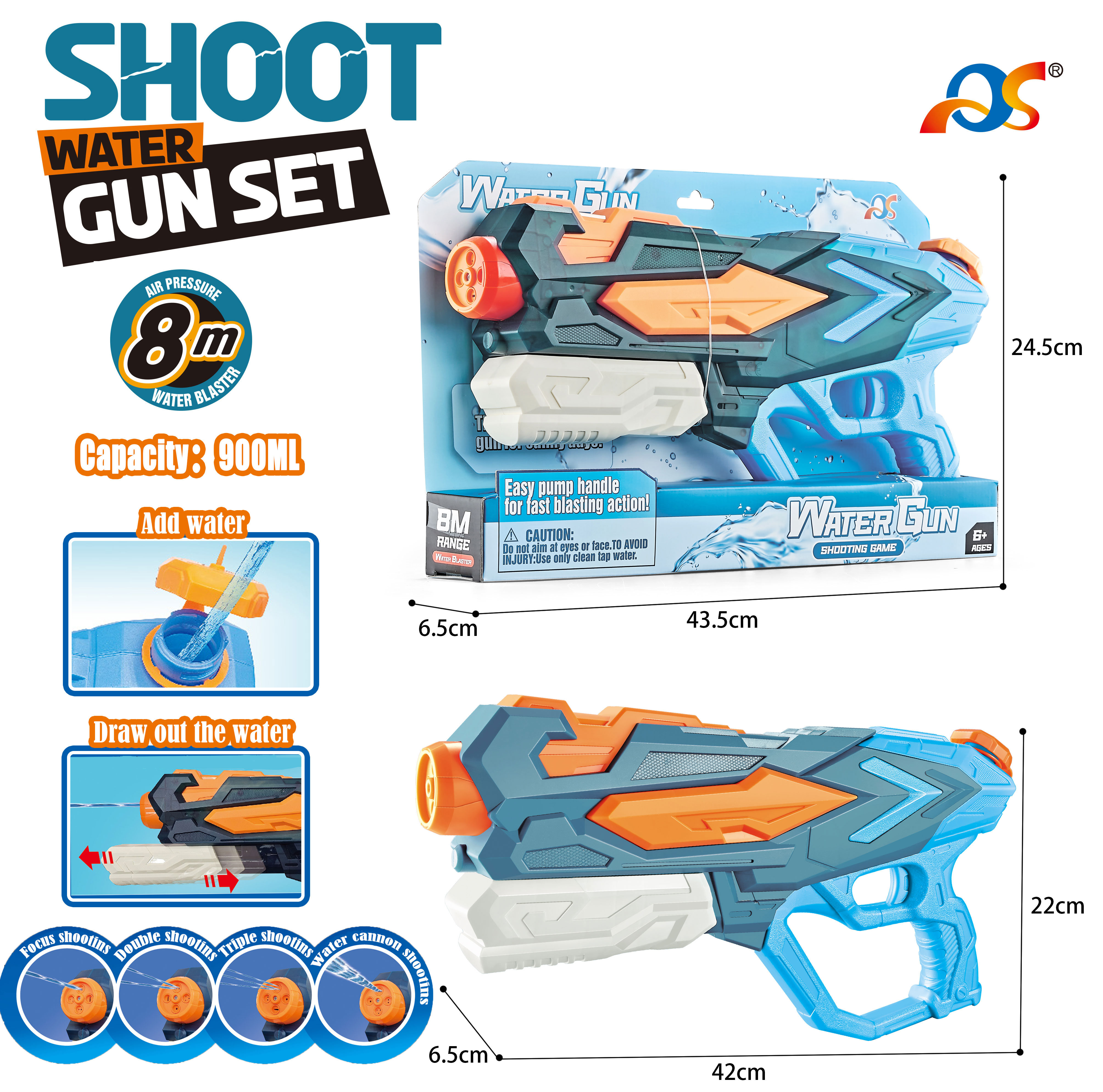 Vodní puška. Rozměry 42x22x6,5 cm. Střelba pumpováním.