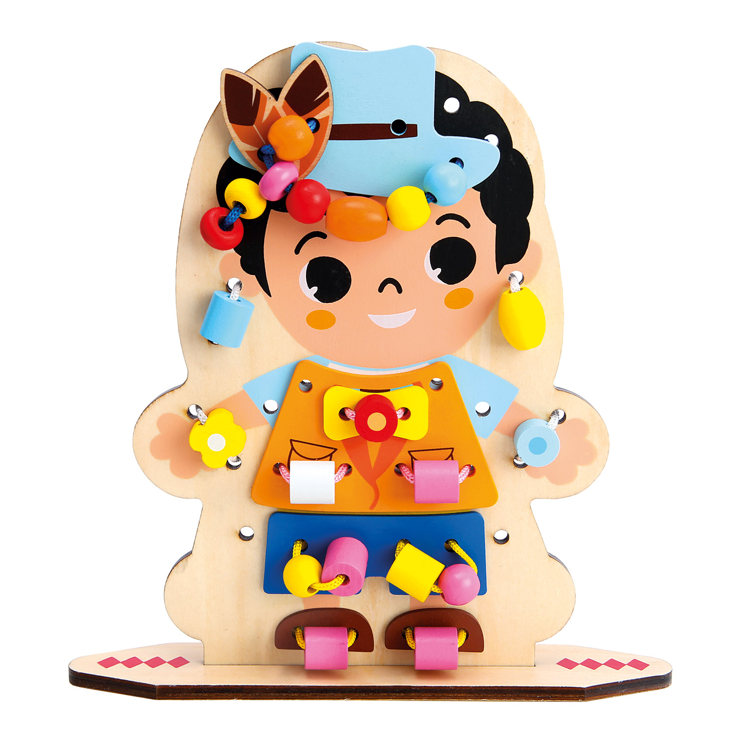 Malé deti strávia nekonečné hodiny krásnym obliekaním dievčatka alebo chlapčeka (obojstranne potlačená doska na navliekanie). Táto roztomilá hra s navliekaním je tak bohatá na doplnky, že sa deti môžu poriadne vyblázniť. Pri hraní tejto jedinečnej a zaujímavej hry s niťami si deti zlepšujú jemnú motoriku, koordináciu rúk a očí, kognitívne myslenie, vizuálne vnímanie, riešenie problémov, trpezlivosť a sústredenie. Je to zábavný spôsob, ako sa deti môžu učiť pri hre. Je to klasická hračka na navliekanie, ktorú si